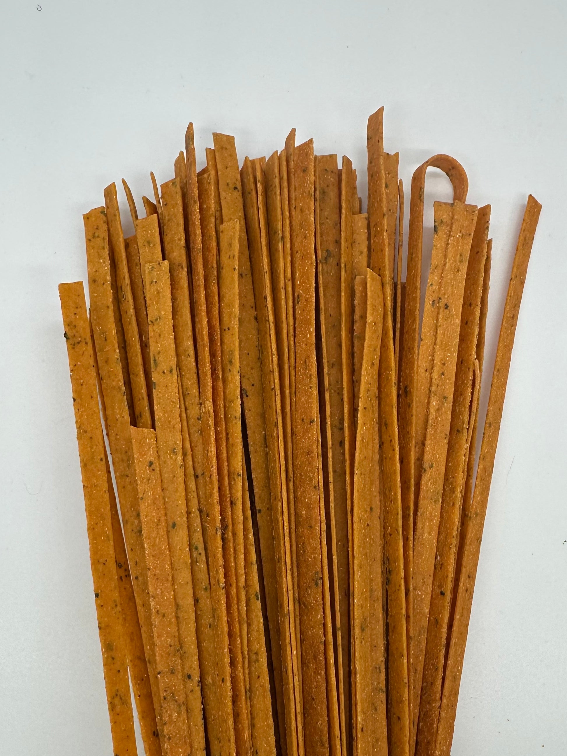 Tangy tomato, sweet basil and a hint of paparika make this fettuccini a popular, versatile dish. Pairs well with sausage, sun dried tomatoes or steamed vegetables. Using semolina durum wheat, the rolled pasta is dried at low temperatures to maintain the quality and flavor of its ingredients.